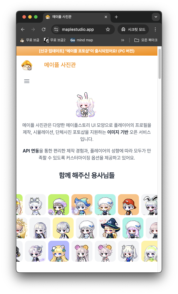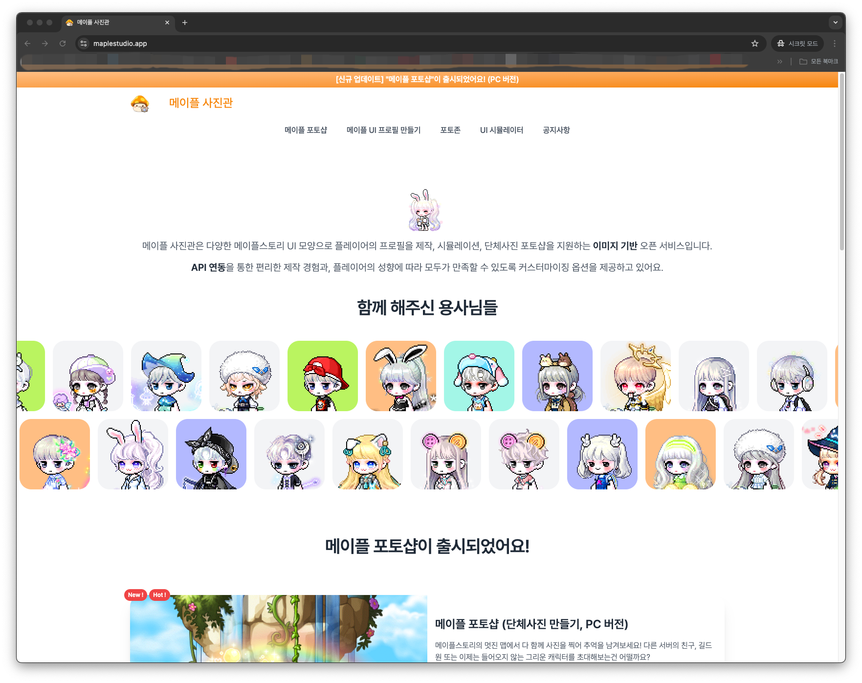 메이플 사진관을 이용해주신 용사님들에게 고마움을 표현하기 위해 다녀간 캐릭터를 좀 더 메인에 예쁘게 전시하기로 했습니다.