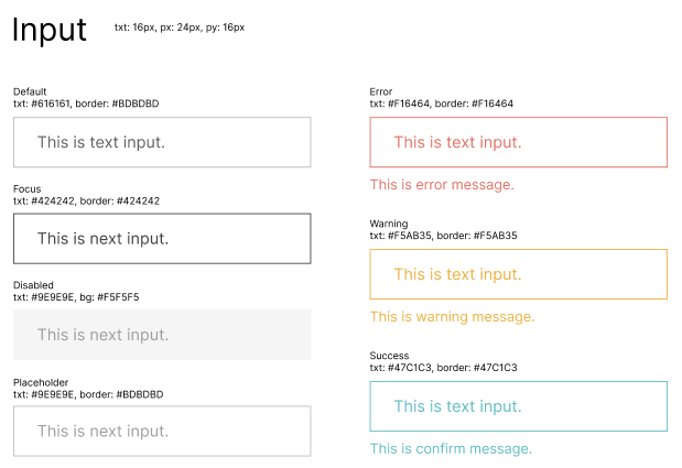 예시로 가져온 Input과 Button입니다. 상태에 따라 컴포넌트 외형에 변경을 주어 사용자가 쉽게 인지할 수 있도록 유도했습니다.