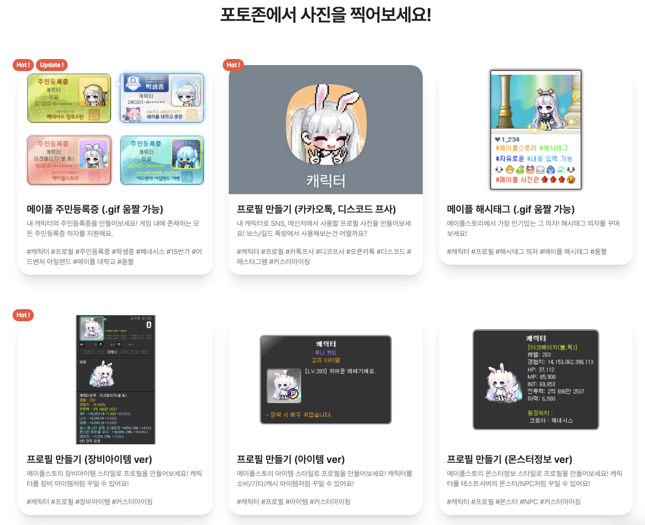 기존 메이플 사진관은 프로필 제작과 시뮬레이션 서비스를 주요 컨텐츠로 제공하고 있었습니다만... 문득 이런 고민이 생겼습니다.