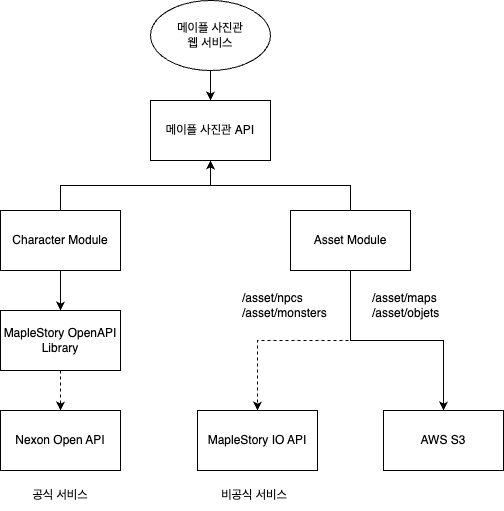 위 사진은 메이플 사진관 API 서버의 Asset Module의 구조입니다. 캐릭터 이미지는 기존 그대로 공식 Nexon API에서 가져오면 되지만 나머지 에셋들은 공식 API에서 지원해주지 않기 때문에 각자 다른 방법을 통해 가져오고 이를 다시 Asset Module로 통합 합니다.