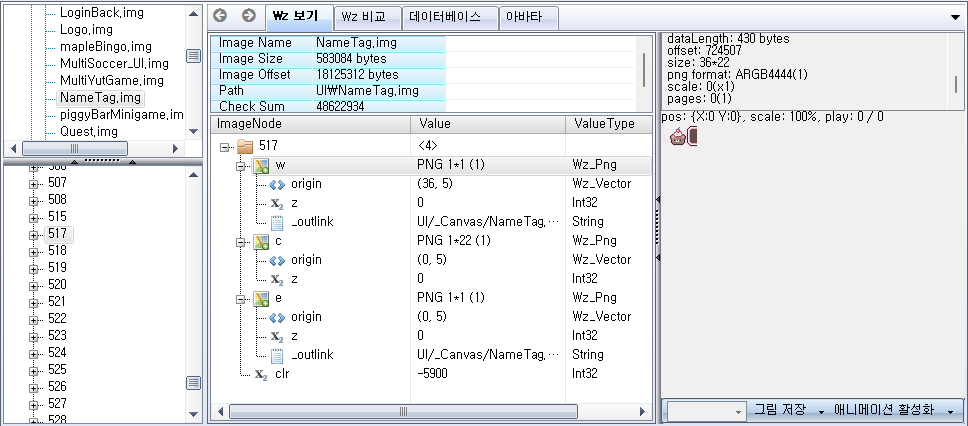다른 노드인 UI/NameTag.img.517으로 들어가니 해당 명찰의 그래픽 정보가 있습니다. west, center, east 구성을 이루는 .png 조각, 그리고 해당 .png가 그려질 위치 보정값(origin), 마지막으로 명찰의 텍스트 색상인 clr(Integer ARGB)이 있네요.