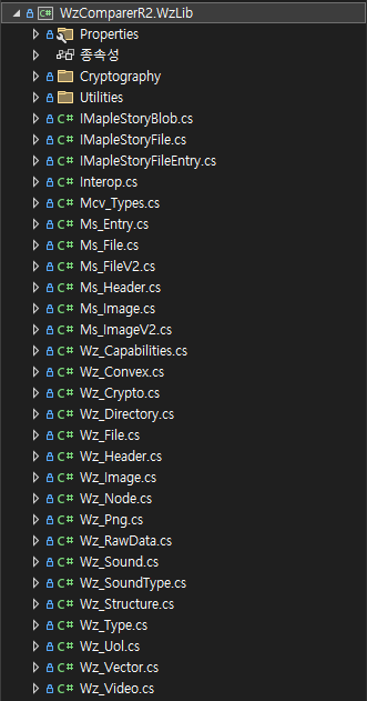 다행히도 위컴알 프로그램은 오픈소스로 공개되어 내부에서 사용중인 WzLib라는 이름의 모듈을 찾을 수 있었습니다. WzLib은 .wz 파일의 구조와 정보를 런타임에서 표현하는 다양한 종류의 자료형이 정의된 모듈입니다.