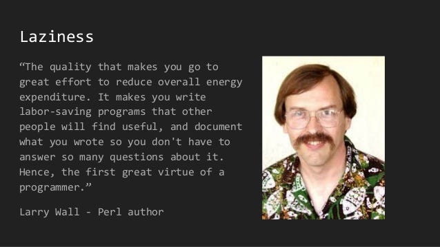 Perl 언어를 개발한 Larry Wall은 프로그래머가 갖춰야 할 3대 덕목(?) 중 첫 번째로 나태(Laziness)를 이야기합니다.