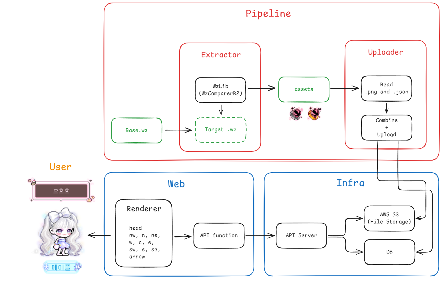 파이프라인은 게임 클라이언트 파일(Base.wz)로부터 Asset 데이터 추출을 담당하는 extractor와 데이터 변환 및 업로드를 담당하는 uploader로 나누어, 최종적으로는 추출된 Asset이 메이플 사진관의 DB와 File Storage까지 자연스럽게 전달되도록 설계했습니다.