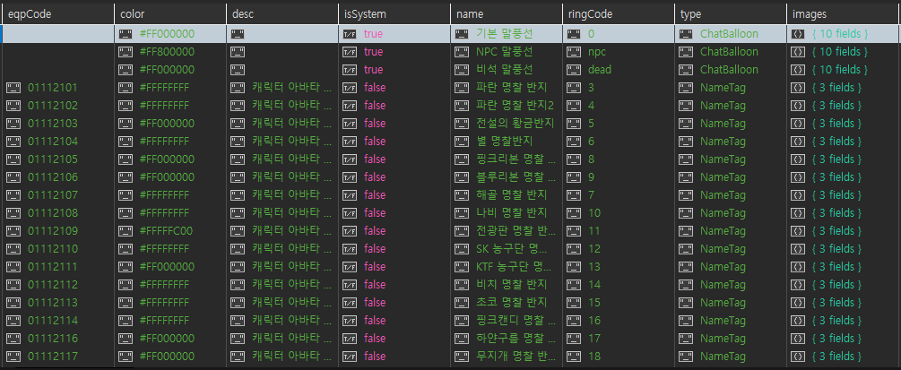 말풍선 & 명찰 반지 아이템 기본 정보 - 이미지 식별 코드 - 아이템 아이콘 - 말풍선 또는 명찰 식별 코드 - 애니메이션 적용 여부 |
