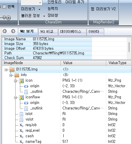 위 사진은 Character/Ring/01115735.img에 위치한 어떤 아이템의 기본 정보입니다. 해당 정보를 통해 icon이 .png 확장자임과 어떤 곳을 참조(_outlink)하는지, 어느 nameTag(517)에 대한 정보인지 등을 알 수 있습니다.