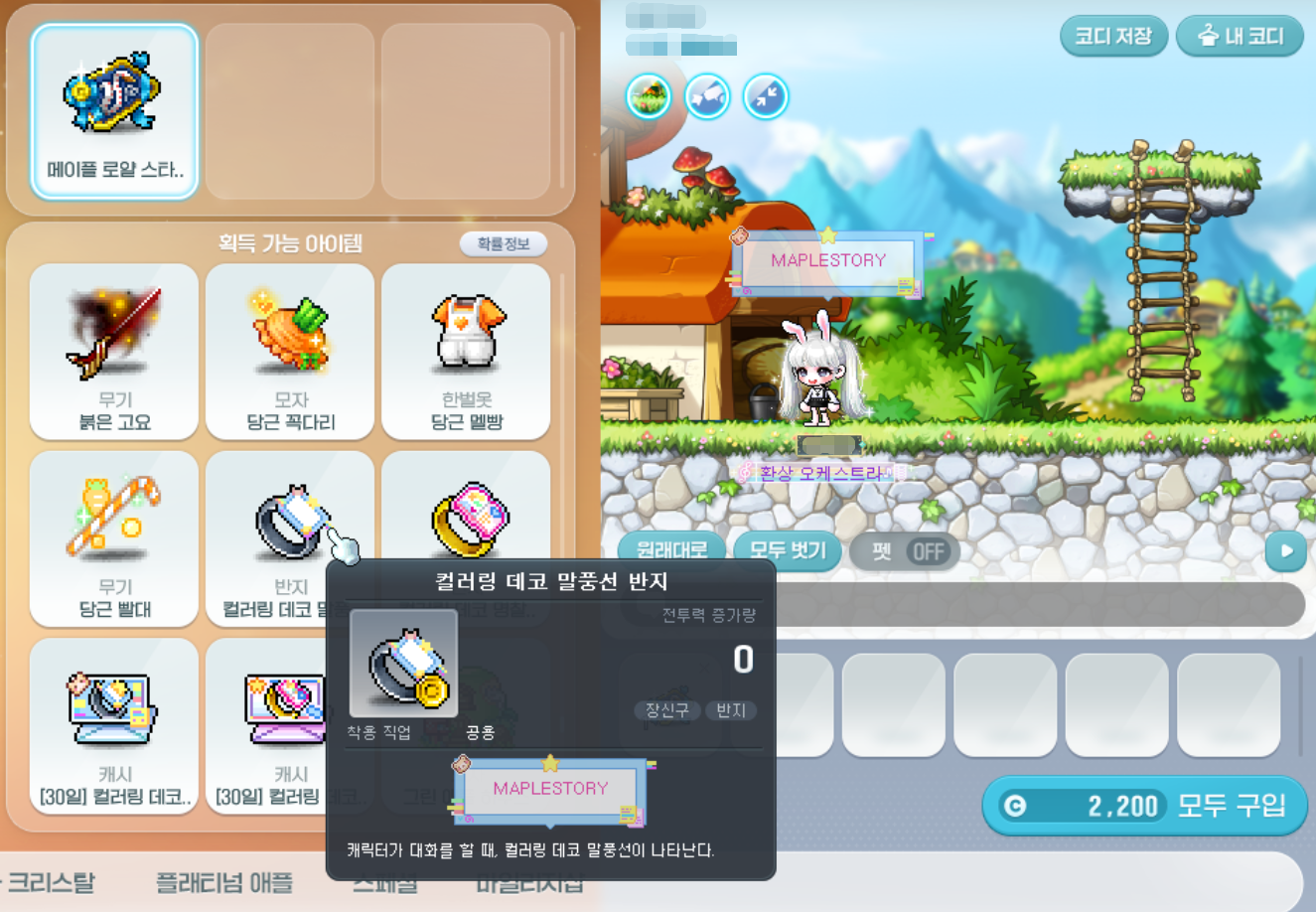 잠시 게임 내부의 이야기를 해보겠습니다. 메이플스토리에서는 캐릭터의 외형을 꾸밀 수 있는 기능과 비슷하게 말풍선과 명찰을 꾸밀 수 있습니다. 커스터마이징은 안되지만 미리 만들어진 모양으로 변경할 수 있도록 장착 가능한 반지 아이템의 형태로 존재하며 모든 플레이어가 하나씩은 꼭 착용할 정도로 인기있는 꾸밈 요소중 하나입니다.