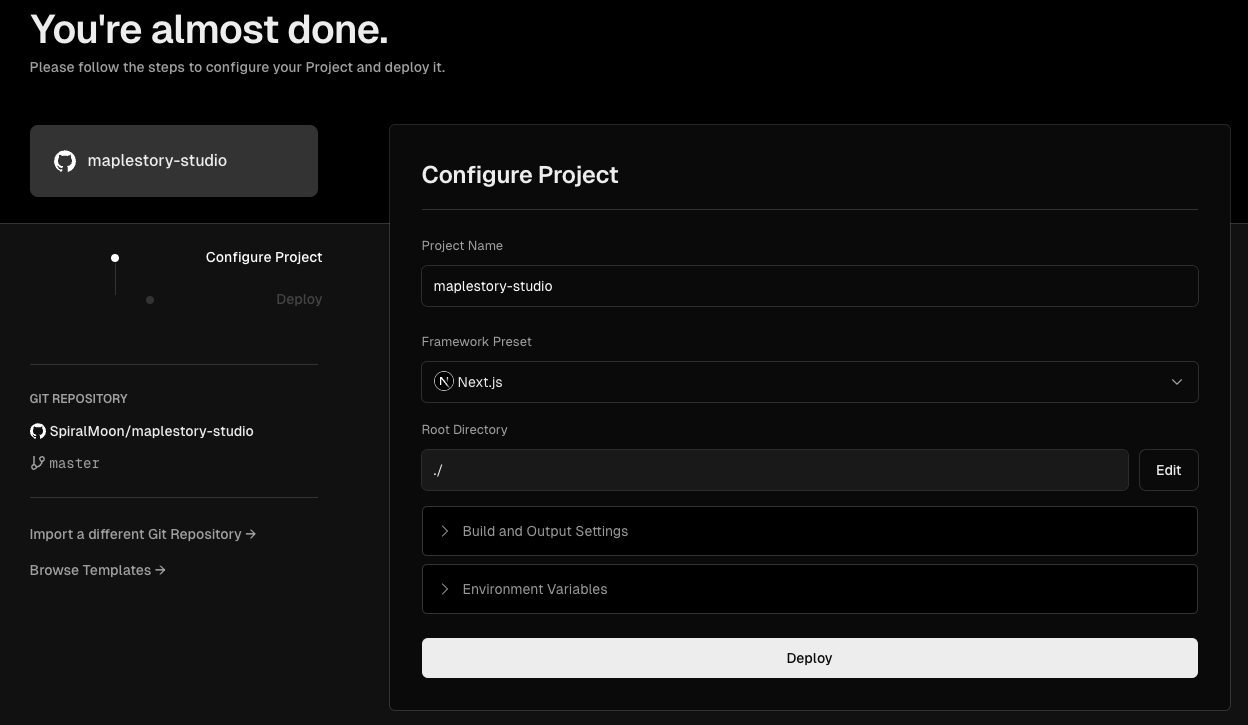 프로젝트는 nextjs로 작성되어 vercel을 이용하면 github 연동 후 별도 설정 없이 바로 호스팅이 가능하다는 얘기를 듣고 호다닥 달려갔습니다. 게다가 무료 호스팅까지 지원된다니! 서버가 미국에 있어서 로딩 속도가 좀 느리지만 무료니까 일단 넘어가기로 했습니다.