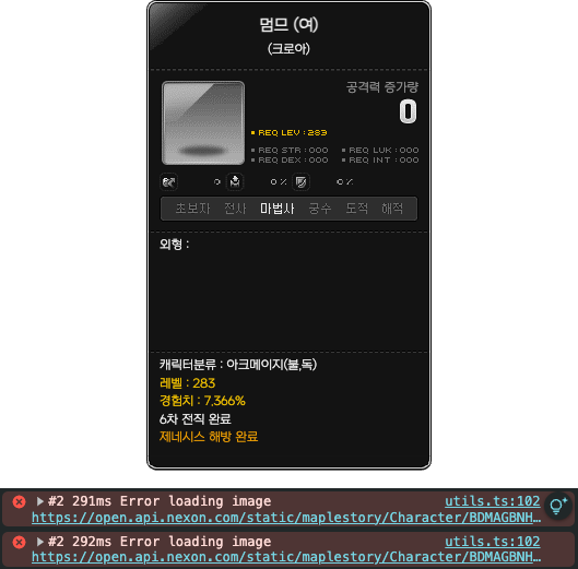 Nexon OPEN API에서 HTTP URL로 제공받던 캐릭터 이미지를 base64로 변환 후 사용하도록 서버 코드를 수정했습니다. 이렇게 하면 이미지 리소스는 로컬화되어 브라우저의 CORS 보안 정책을 회피할 수 있습니다.