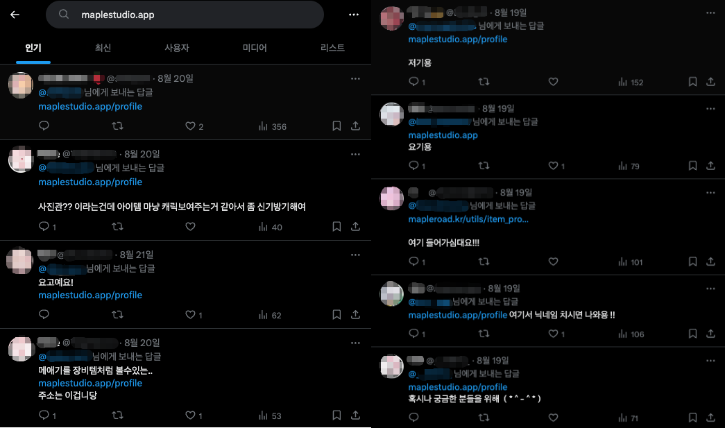 메이플 사진관은 사람들의 입소문을 타고 널리 퍼지게 되어 각종 커뮤니티까지 전파되었습니다. 여러 유저들이 하나가 되어 서비스를 즐겨주신 모습을 보니 개발자로서 정말 뿌듯함을 느낍니다.
