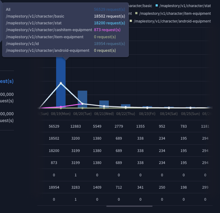 서비스 공개 시점으로부터 당일날 캐릭터 검색이 18,000회 발생하였고, S3에 저장한 로그 파일 기준으로 3시간만에 4,500회 / 24시간만에 13,000회 이상의 프로필 다운로드가 발생했습니다.