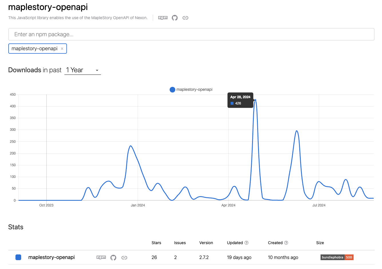 특히 js/ts로 작성된 라이브러리는 NPM에서 다운로드 수도 꽤 집계되고 있으며, 현재까지도 넥슨 측의 변경사항에 따라 꾸준히 업데이트 버전을 제공중입니다.
