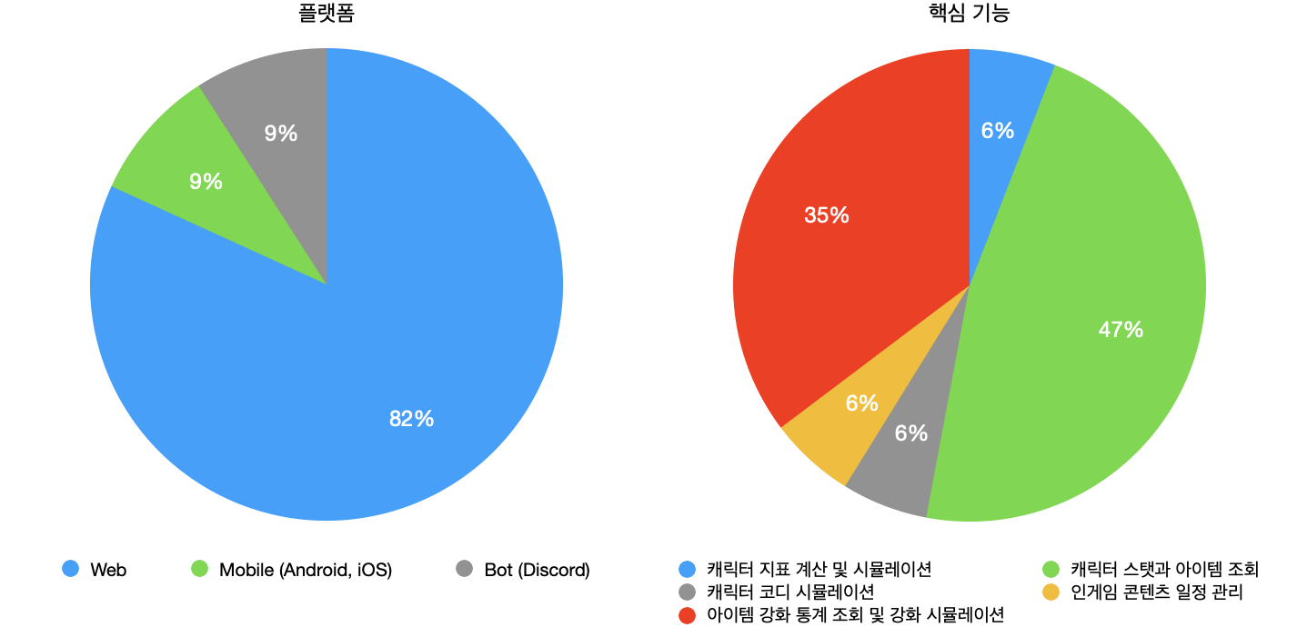 서비스의 대부분이 웹서비스로 제공되고 있으며, 공통적으로 캐릭터 정보 조회와 아이템 강화 시뮬레이션 기능을 제공한다는 점을 파악했습니다.