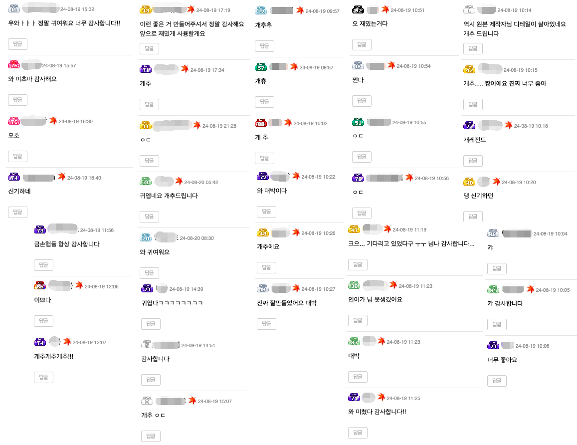 이 과정에서 지인 한 분이 커뮤니티에 자랑글을 올리기도 했었는데, 조회수가 무려 6만에 달했고 댓글창에 "직접 써보고 싶다", "귀엽다", "갖고싶다" 등의 긍정적인 코멘트가 많이 달렸습니다. 앞에서 좋은 반응이 있을 것이라고 확신했었는데 예상 적중 했습니다.