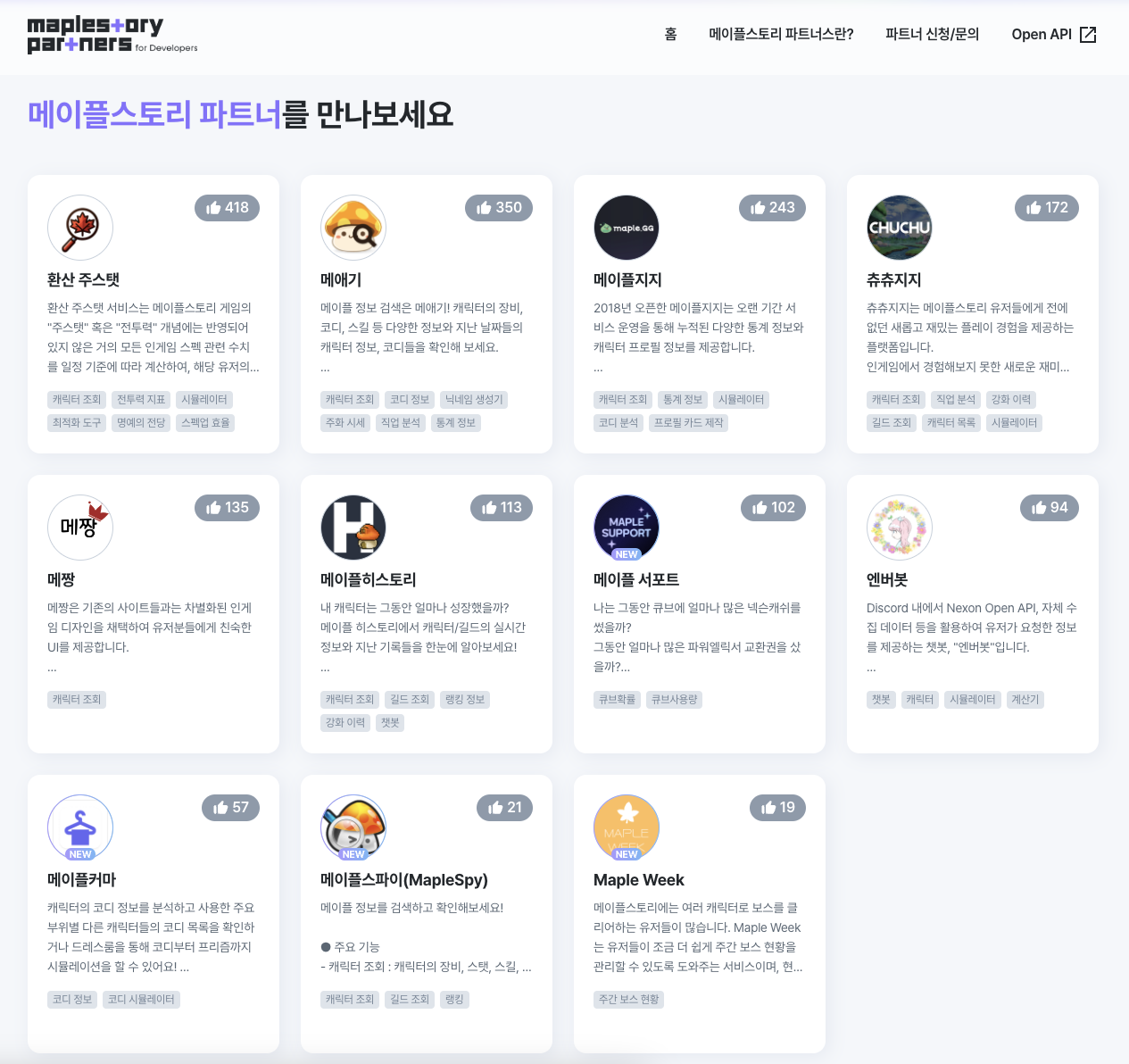 넥슨이 OPEN API를 공개한 이후로 개발자들은 주로 메이플스토리 게임 플레이를 돕거나 기록 조회가 중심이 되는 서비스를 만들었습니다.