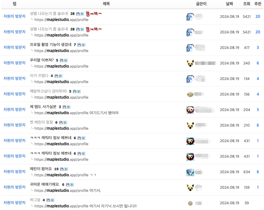 메이플 사진관은 사람들의 입소문을 타고 널리 퍼지게 되어 각종 커뮤니티까지 전파되었습니다. 여러 유저들이 하나가 되어 서비스를 즐겨주신 모습을 보니 개발자로서 정말 뿌듯함을 느낍니다.