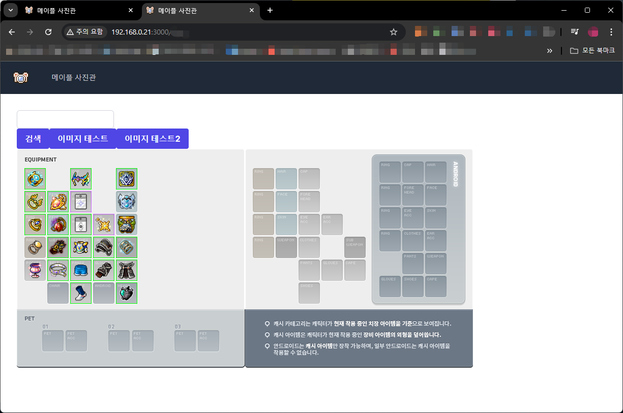 maplestory-openapi 라이브러리로 캐릭터의 데이터를 조회할 수 있는 개발용 페이지를 만들고 이 곳에서 ToolTip 개발과 테스트를 진행했습니다.