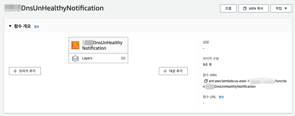 us-east-1 리전에 Lambda를 생성하고 트리거 추가 버튼을 클릭한다. 여기서는 엔드포인트의 비정상 경보 메시지를 가공 및 Slack으로 전달하는 역할을 할 것이다.