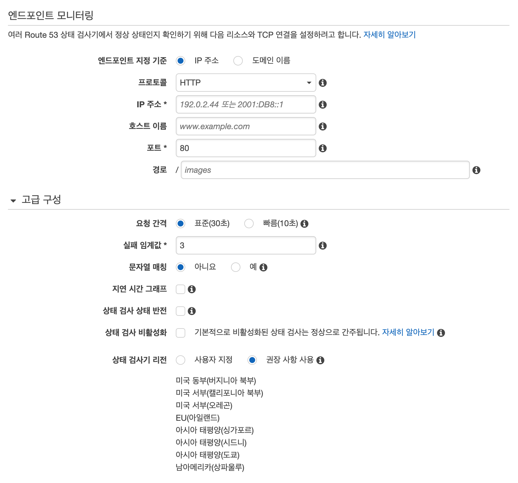 모니터링 할 엔드포인트의 프로토콜, 주소, 포트, 경로를 지정한다. (AWS에서 호스팅중이 아닌 엔드포인트도 지정 가능)