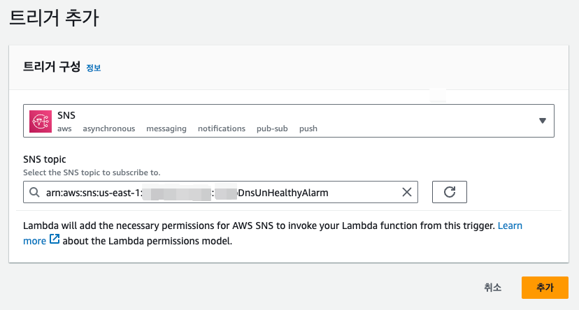 us-east-1 리전에 Lambda를 생성하고 트리거 추가 버튼을 클릭한다. 여기서는 엔드포인트의 비정상 경보 메시지를 가공 및 Slack으로 전달하는 역할을 할 것이다.