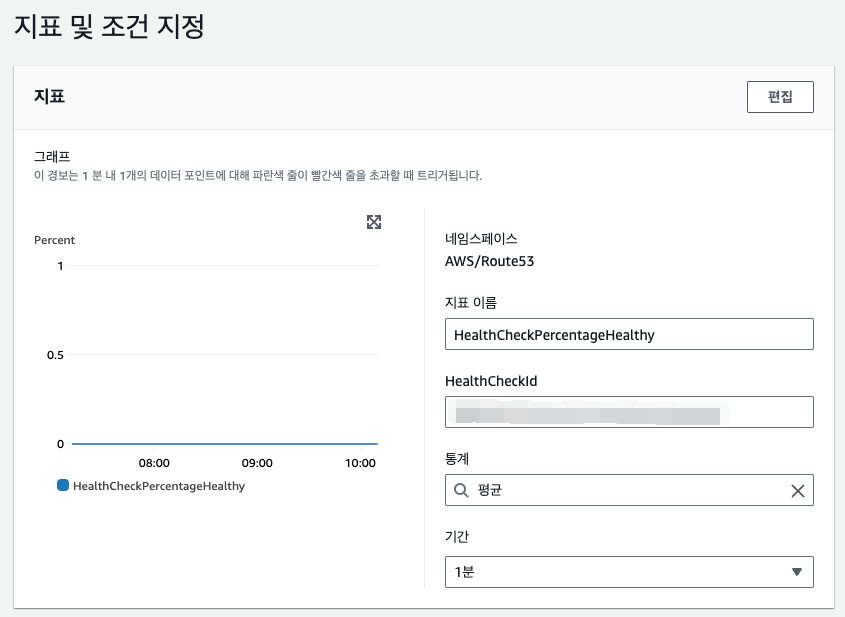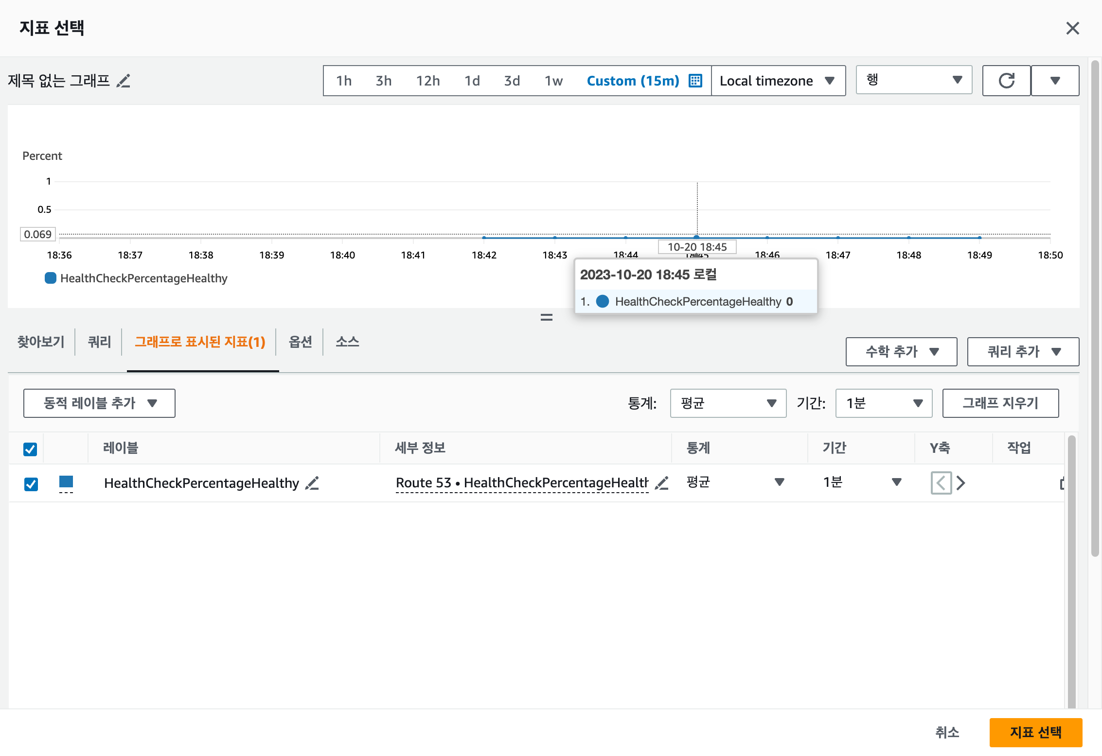 그래프로 표시된 지표 탭에서 HealthCheckPercentageHealthy 레이블을 선택하고 지표 선택 버튼을 클릭한다.
