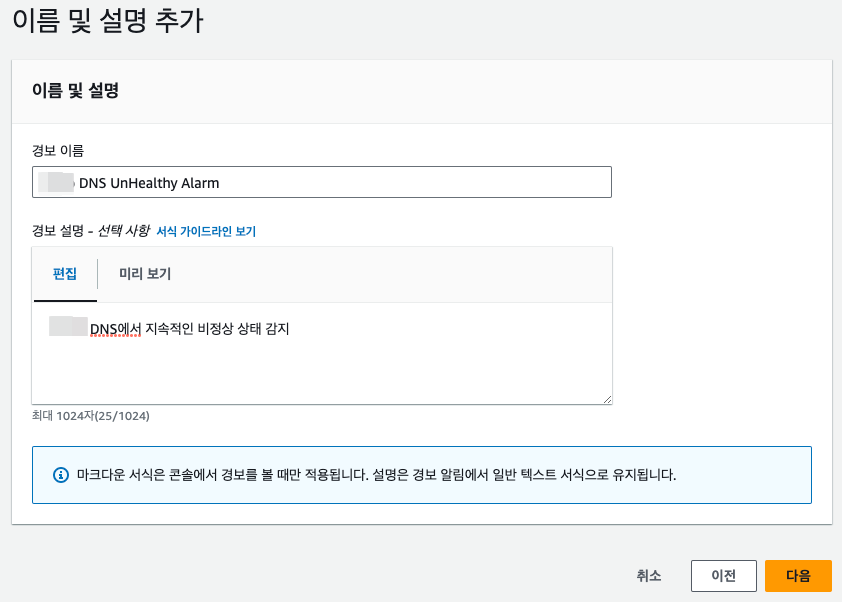 마지막으로 CloudWatch 경보의 이름과 설명을 지어준다. 이름과 설명 정보는 SNS 알람을 통해 전달되므로 적절하게 작성하자.