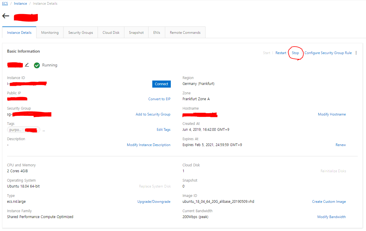위 사진은 인스턴스의 요약정보를 나타낸다. 아래에 Reinitialize Disks 가 있지만 ECS가 실행 상태이기 때문에 버튼이 비활성화 되있다.