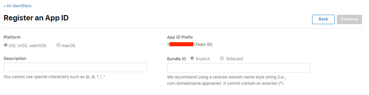Identifier를 지어준다. 보통 App ID(Bundle ID)를 역순으로 배치해서 쓴다.