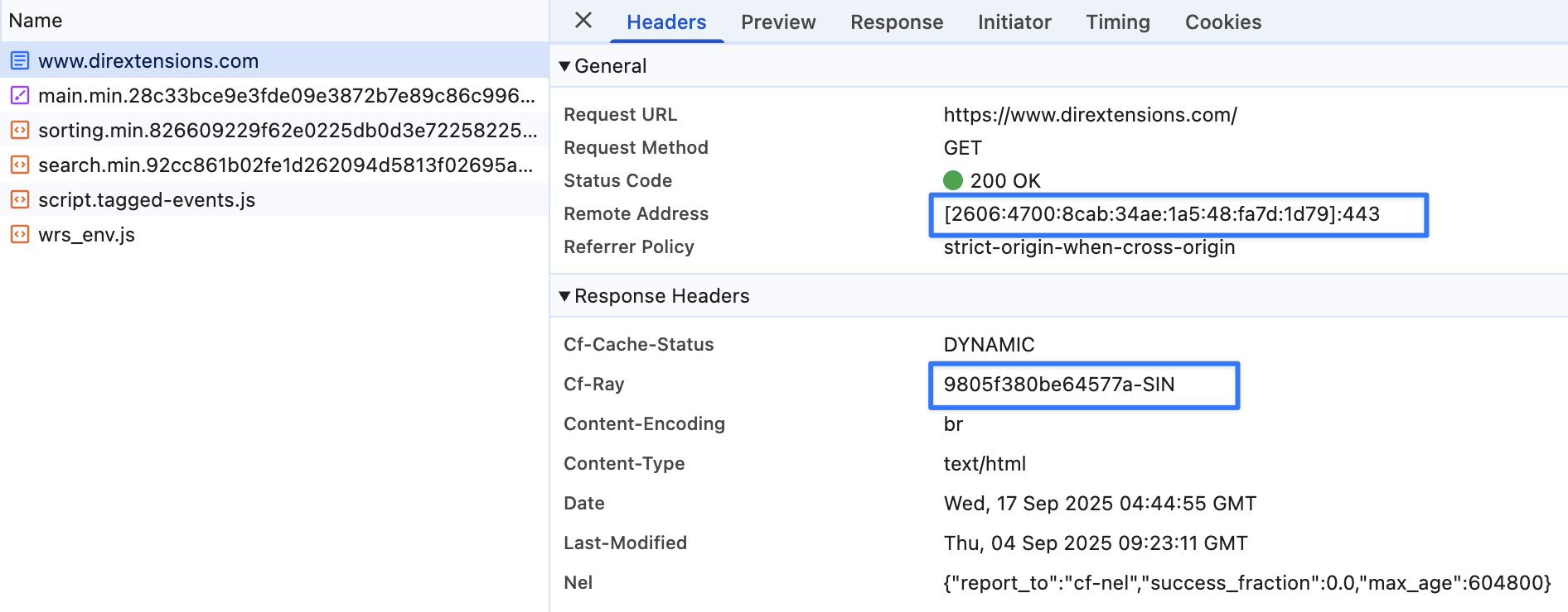 응답 Cf-Ray 헤더는 제 요청이 여전히 싱가포르 데이터 센터에서 처리되고 있음을 보여주었습니다.