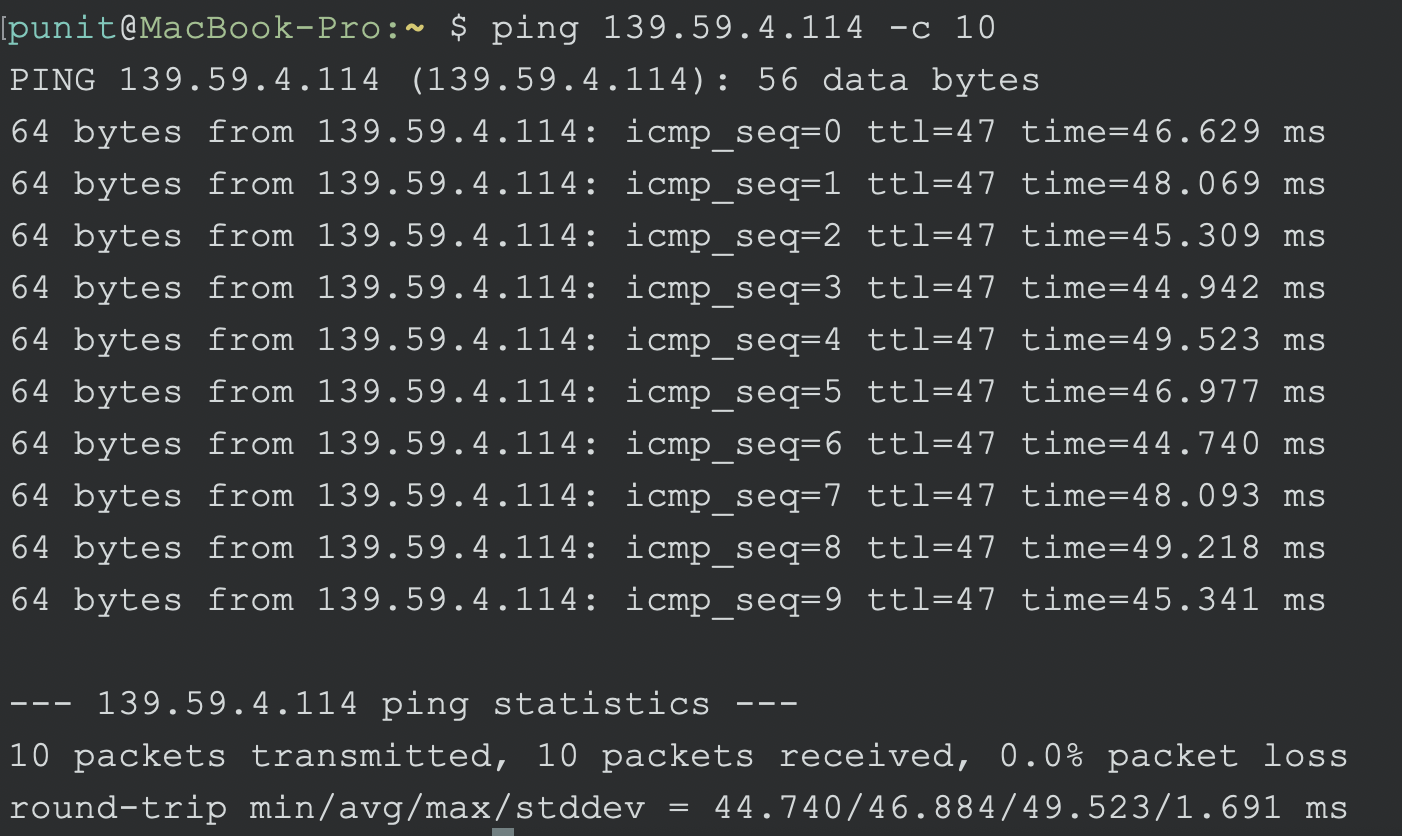 - 요청이 서버에 도달하고 응답이 돌아오는데 걸리는 시간은 평균 약 47ms입니다. (RTT Latency)