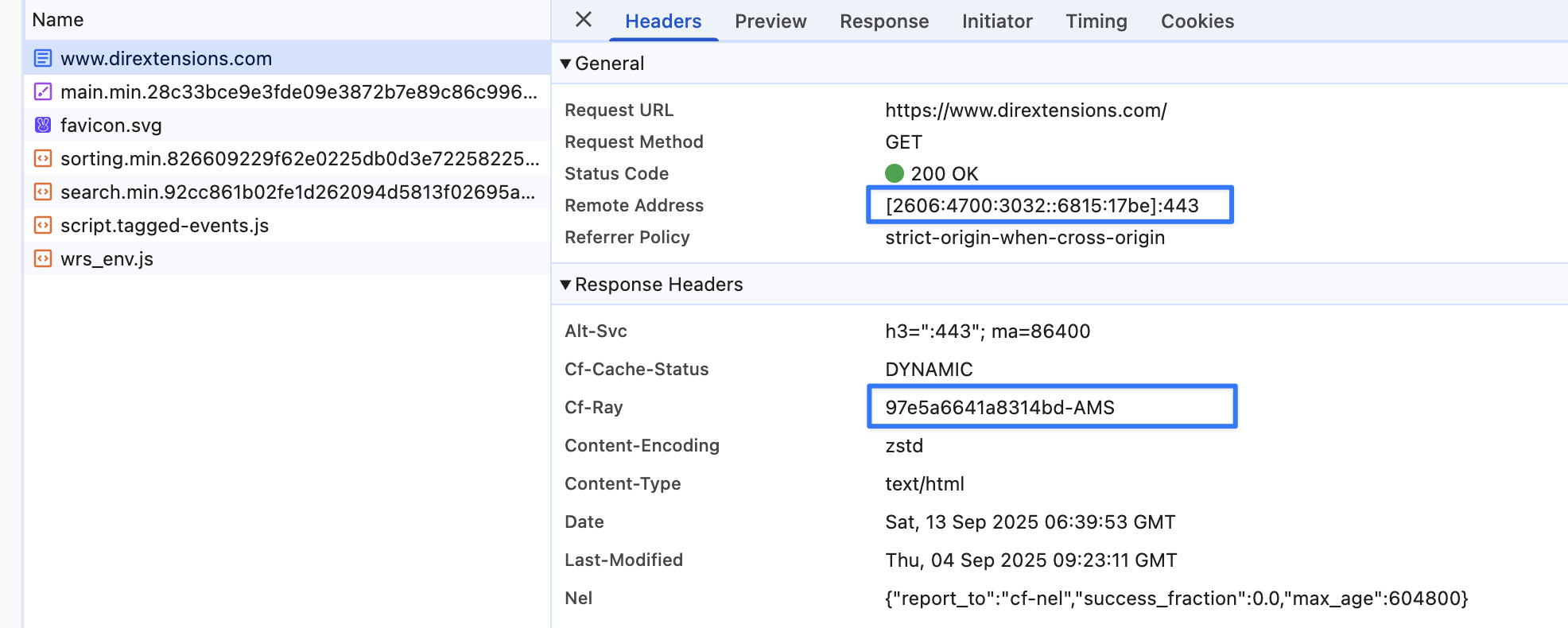 다른 ISP에서 제 사이트에 접속할 때 어떤 CloudFlare 데이터 센터가 요청을 처리하는지 확인하기 위해 추가 검사를 실행했습니다.