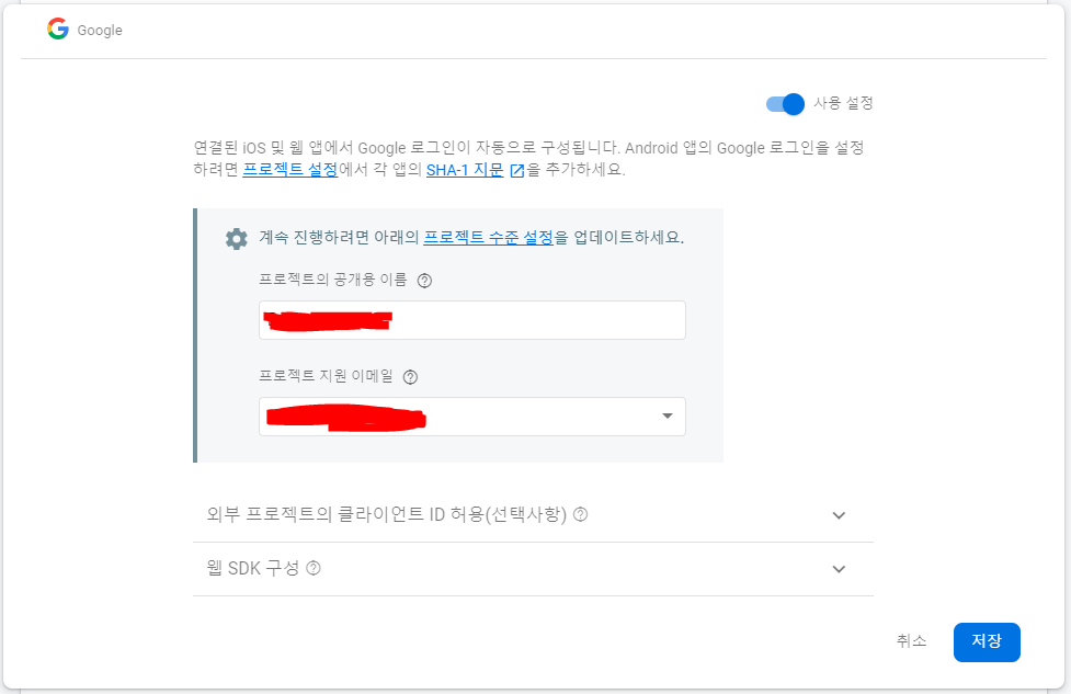 사용 설정을 활성화 시키고 프로젝트의 공개용 이름과 지원 이메일 주소를 선택한다. 공개용 이름은 사용자가 구글 인증을 시도할 때 보여질 앱 이름이다.