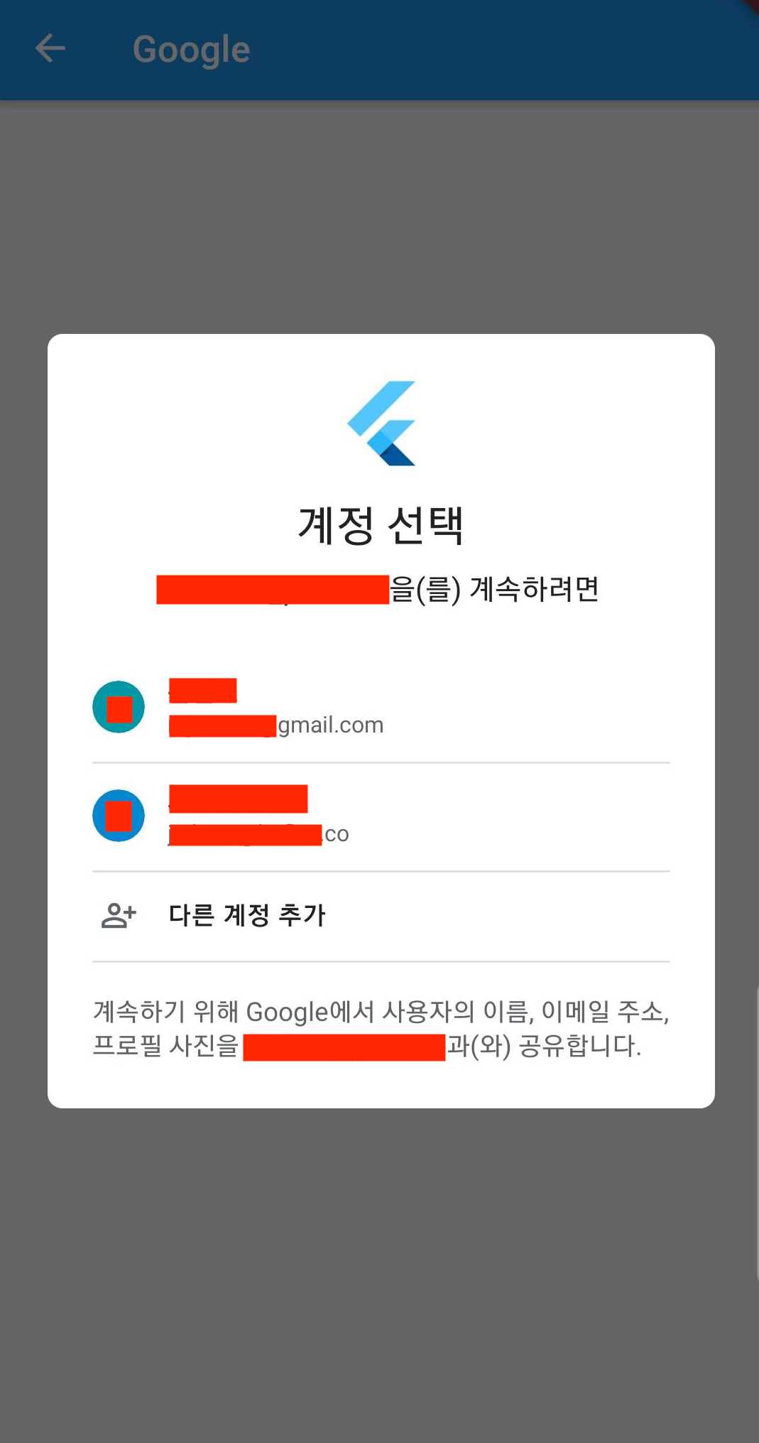 GoogleSignIn 객체의 signIn( )함수를 사용하면 안드로이드에서는 구글 로그인 화면이, iOS에서는 구글 로그인 웹페이지가 나타나며, 로그인한 유저 정보를 반환한다.