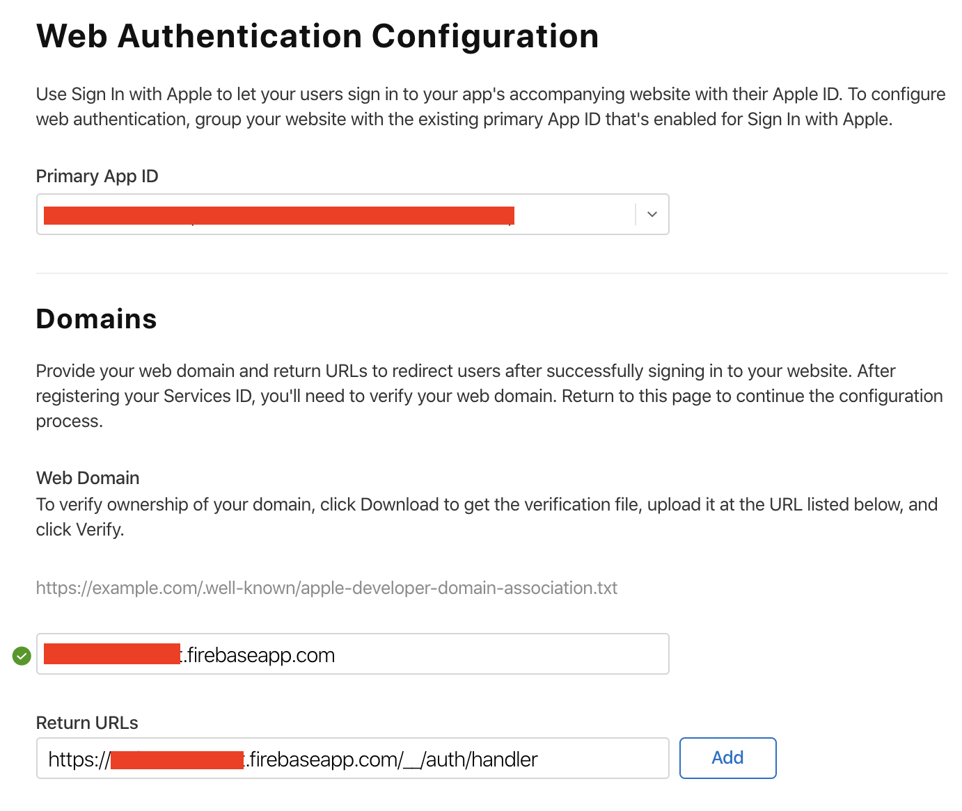 애플 로그인 인증 절차에 사용할 도메인과 Callback URL(Return URLs)을 등록하는 화면이 나온다.