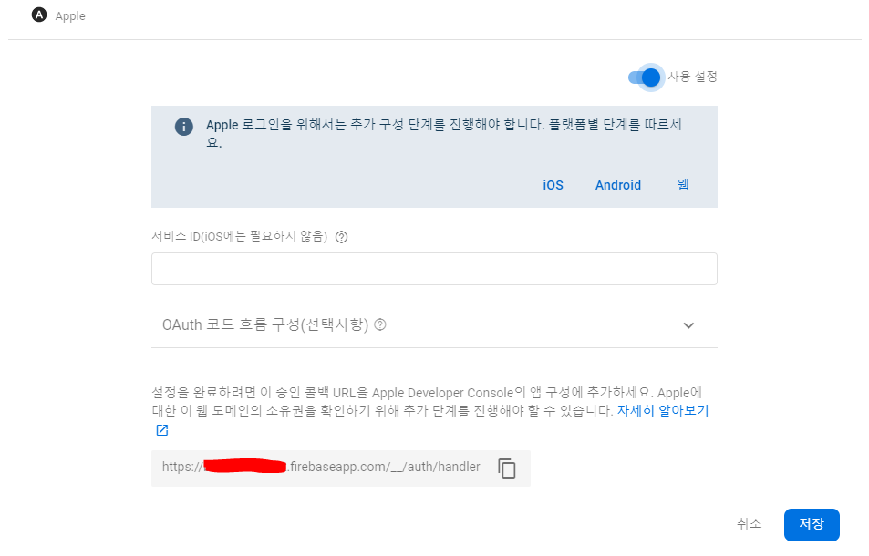 파이어베이스 콘솔에서 "개발 >> Authentication >> 로그인 방법" 으로 들어와 목록에서 Apple을 활성화 한다.