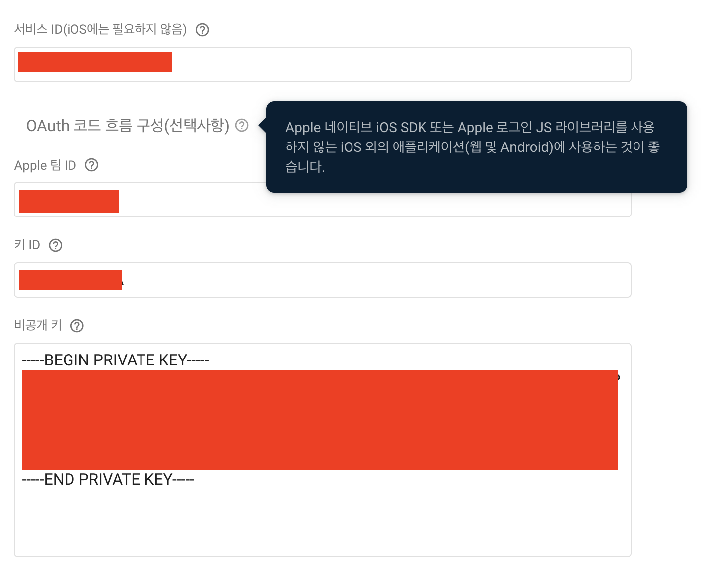 서비스 ID나 OAuth 코드 흐름 구성은 애플 로그인을 iOS에서만 구현한다면 비워도 되지만, 안드로이드에서도 구현할 예정이라면 채워야 한다.