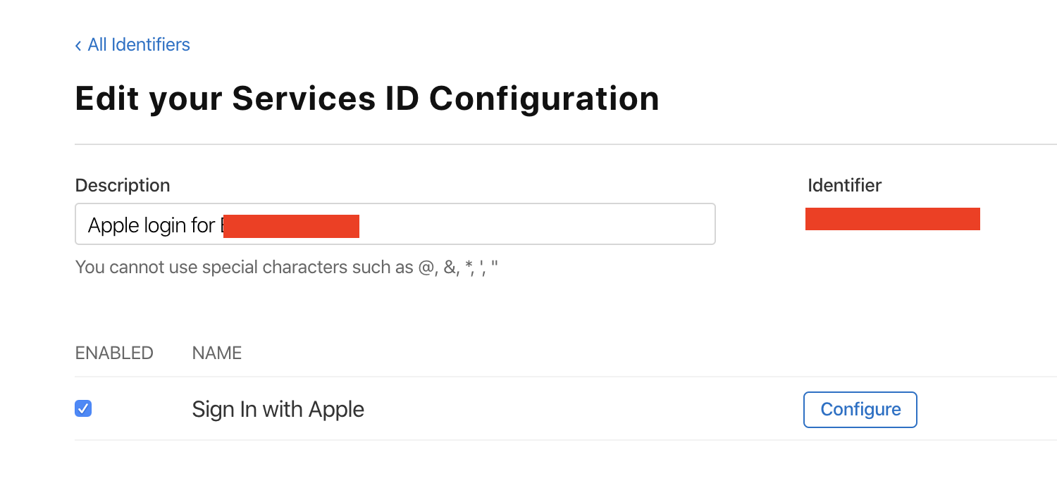 애플 개발자 페이지에 접속하고 "Identifiers >> Services IDs"로 들어와서 이전에 만들어두었던 서비스 아이디를 찾는다.
