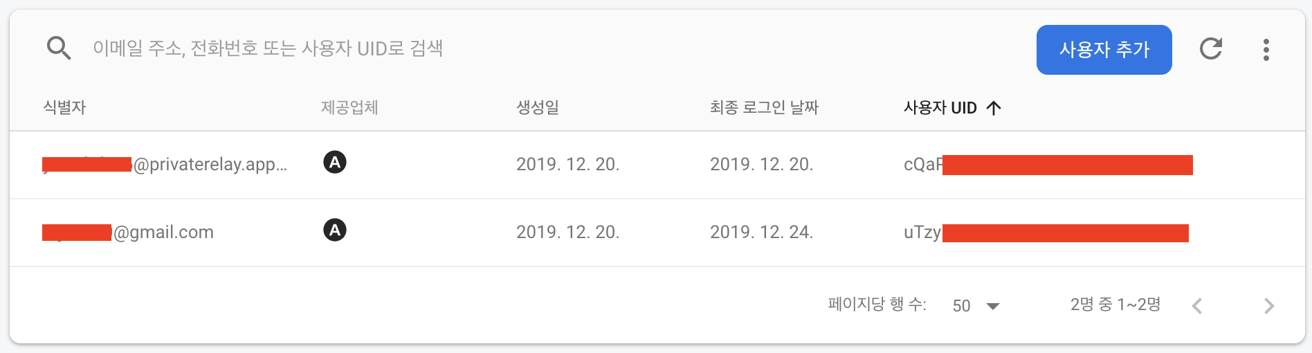 이후에 파이어베이스 페이지에서 확인해보면 애플 로그인을 사용한 계정 목록을 볼 수 있다.