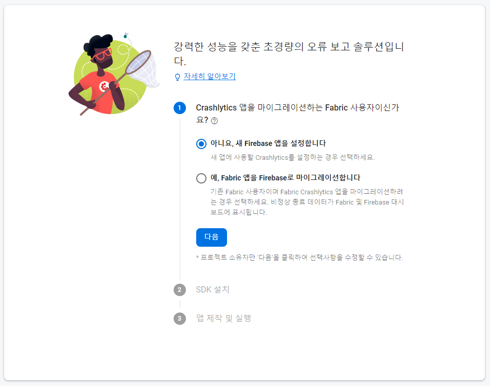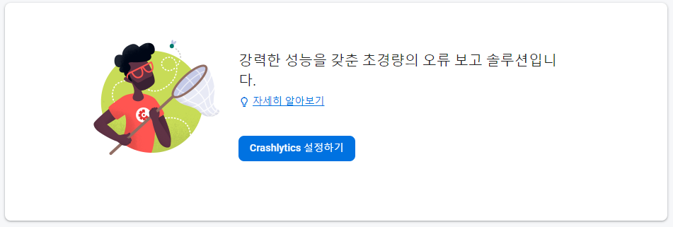 Crashlytics를 적용하는 방법은 매우 간단하다. 파이어베이스 프로젝트를 미리 생성해두었다면 웹에서 별도로 설정해야하는 과정이 없다.