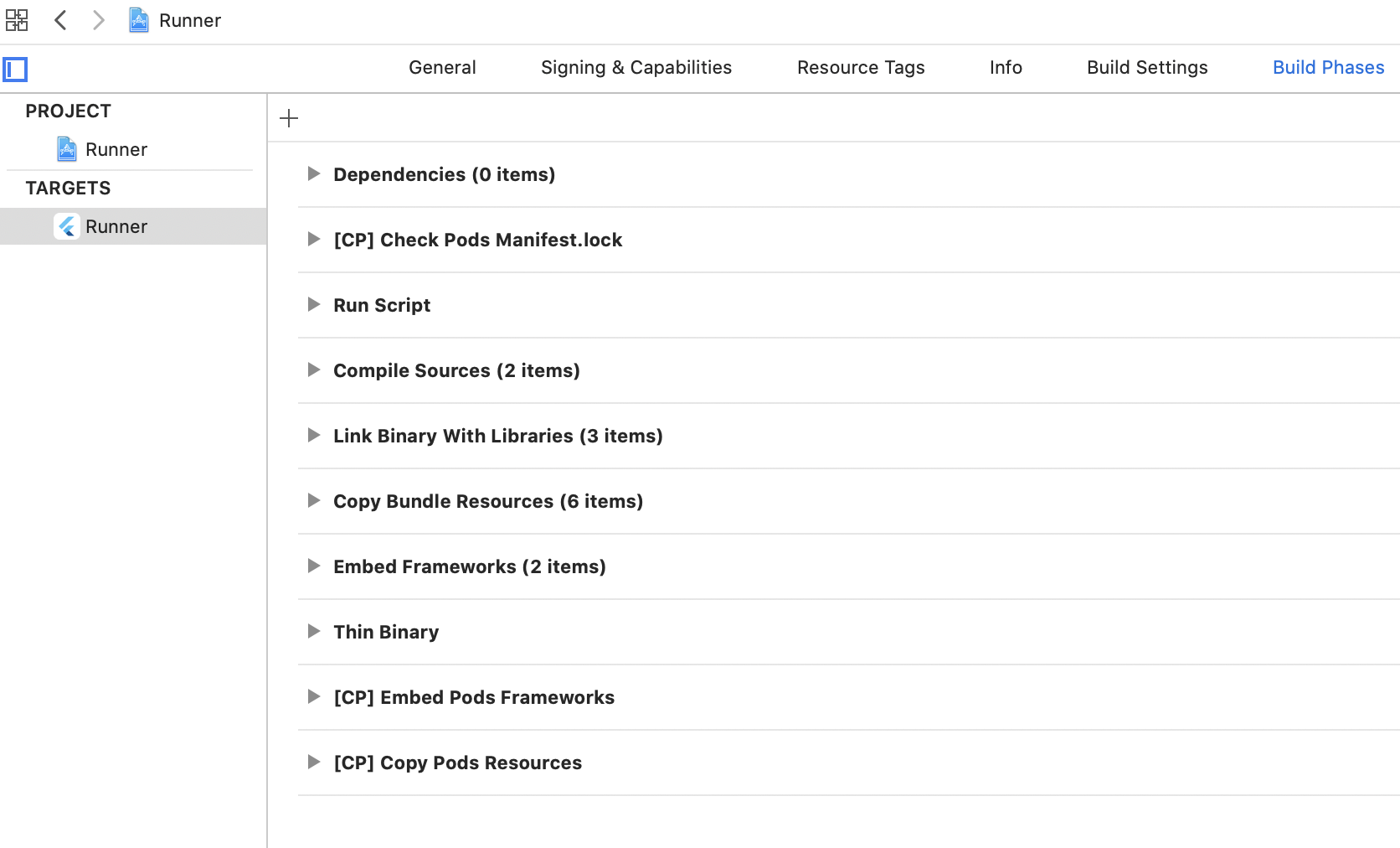 Runner 탭에서 Build Phases 항목을 선택한다.