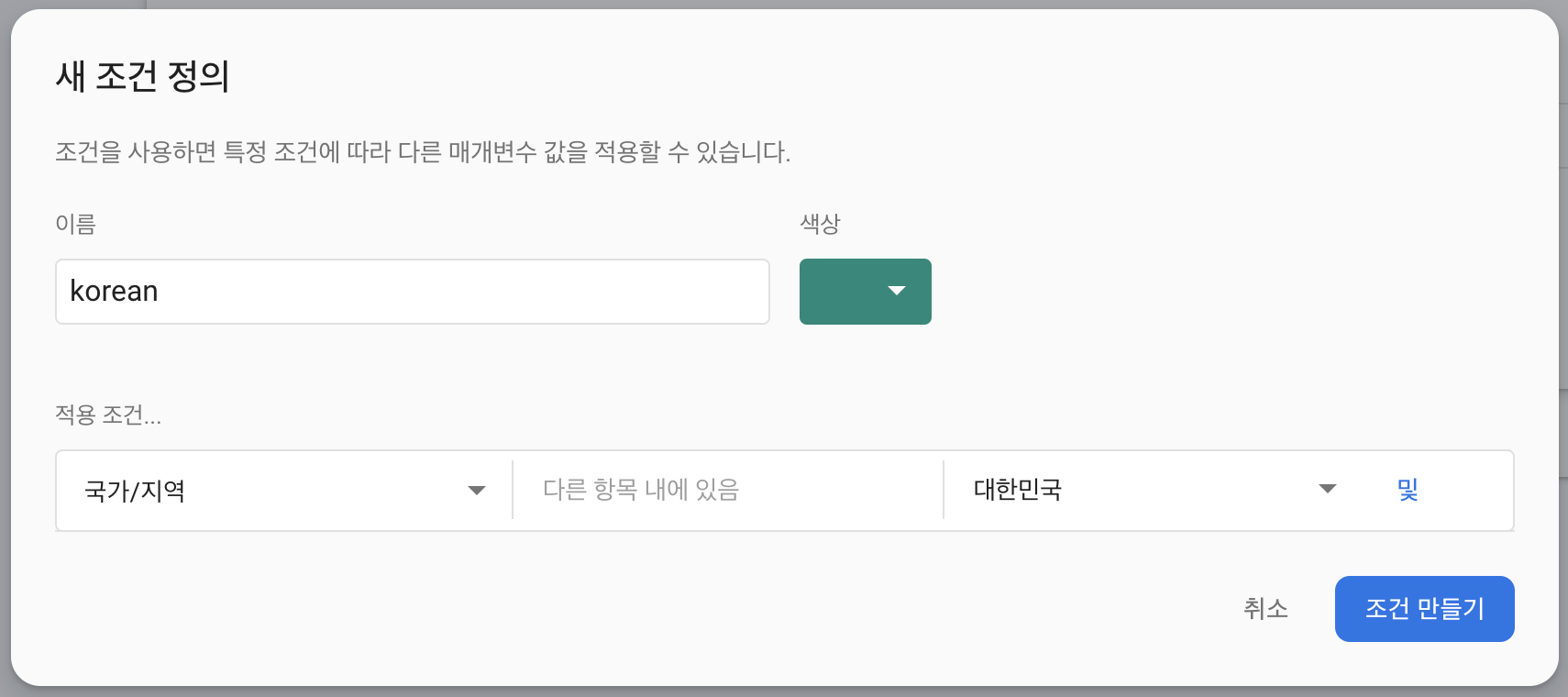 한국 유저에게만 해당하는 조건을 만들어보자. 조건의 이름을 korean으로 짓고 적용 조건을 선택한다.