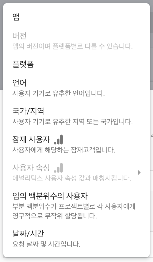 앱 종류, 앱 버전, 플랫폼 종류, 기기 언어, 기기 국가정보, 사용자 그룹, 시간 등의 조건을 제공해주고 있다. 조건은 중복으로도 선택 가능하다.