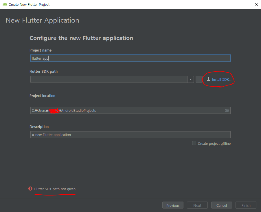 사진 빨간색 동그라미 안쪽의 Install SDK를 눌러서 Flutter SDK를 바로 설치할 수 있다.