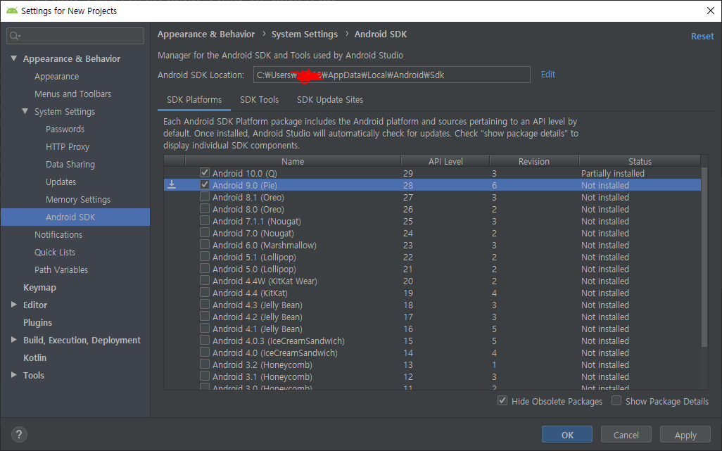 Settings에서 Android SDK가 정상적으로 설정되었는지 살펴본다. 본인의 경우에는 9.0가 깔려있지 않아서 빌드가 안되는 것이었다.