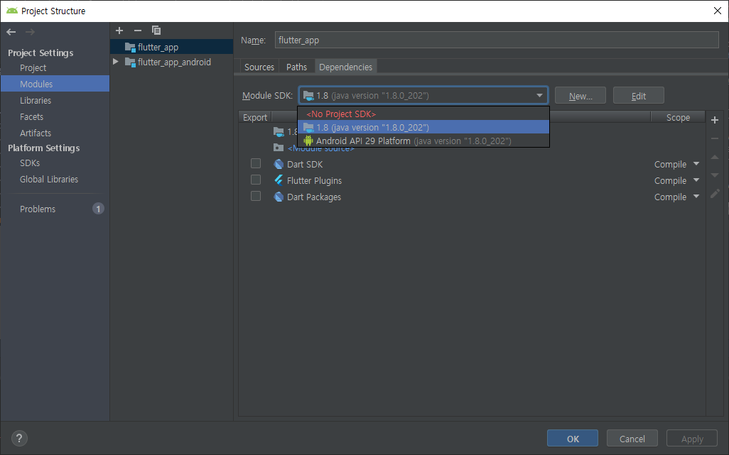 Project structure에서 Module SDK(jdk)가 설정되었는지 살펴본다.