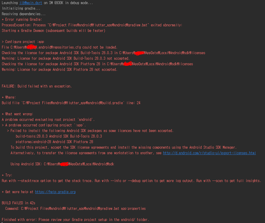 프로젝트 빌드를 시도했을 때 위와 비슷하게 SDK, 라이센스라는 단어가 나오는 에러메시지가 출력된다면 아래와 같이 해결하면 된다.