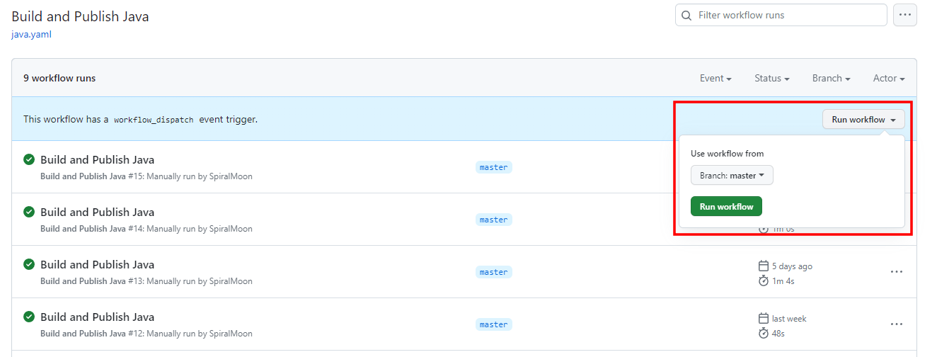 버튼 클릭으로 실행할 것이기 때문에 on 트리거를 workflow_dispatch로 지정했다. 실행환경을 ubuntu-latest로 설정하고 환경변수 OSSRH_USERNAME, OSSRH_PASSWORD, GPG_SECRET_KEY, GPG_PASSPHRASE를 불러오도록 했다. 그리고 JDK의 버전을 지정해주었다.