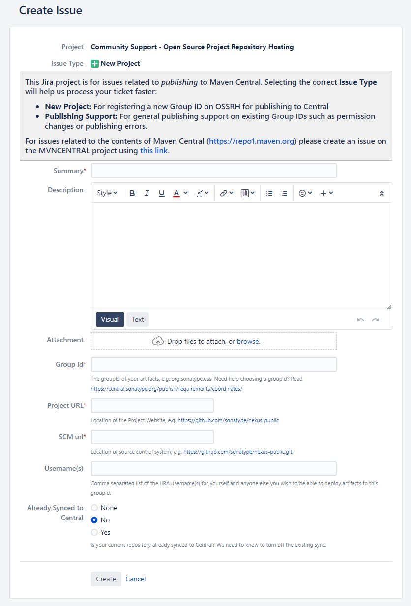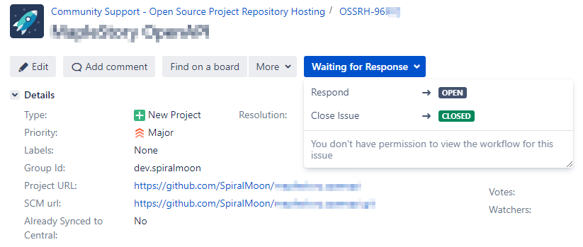 - Sonatype Jira에 이슈 등록 및 도메인 소유권 인증