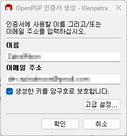 인증서의 이름을 짓고 본인의 이메일 주소를 입력한다. 암구호 옵션을 활성화한 뒤 고급 설정 클릭