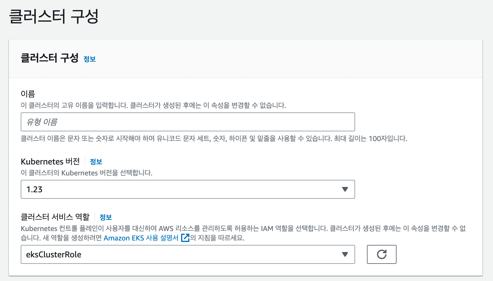 클러스터의 이름과 Kubernetes 버전, 서비스 역할을 지정한다.